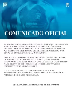 Estudiantes de Río Cuarto sumó un nuevo capítulo que preocupa en medio del mal presente deportivo porque el club comunicó que separó del plantel a un grupo de jugadores por “situaciones que no se alinean con la entrega, compromiso y los objetivos deportivos” de la institución.